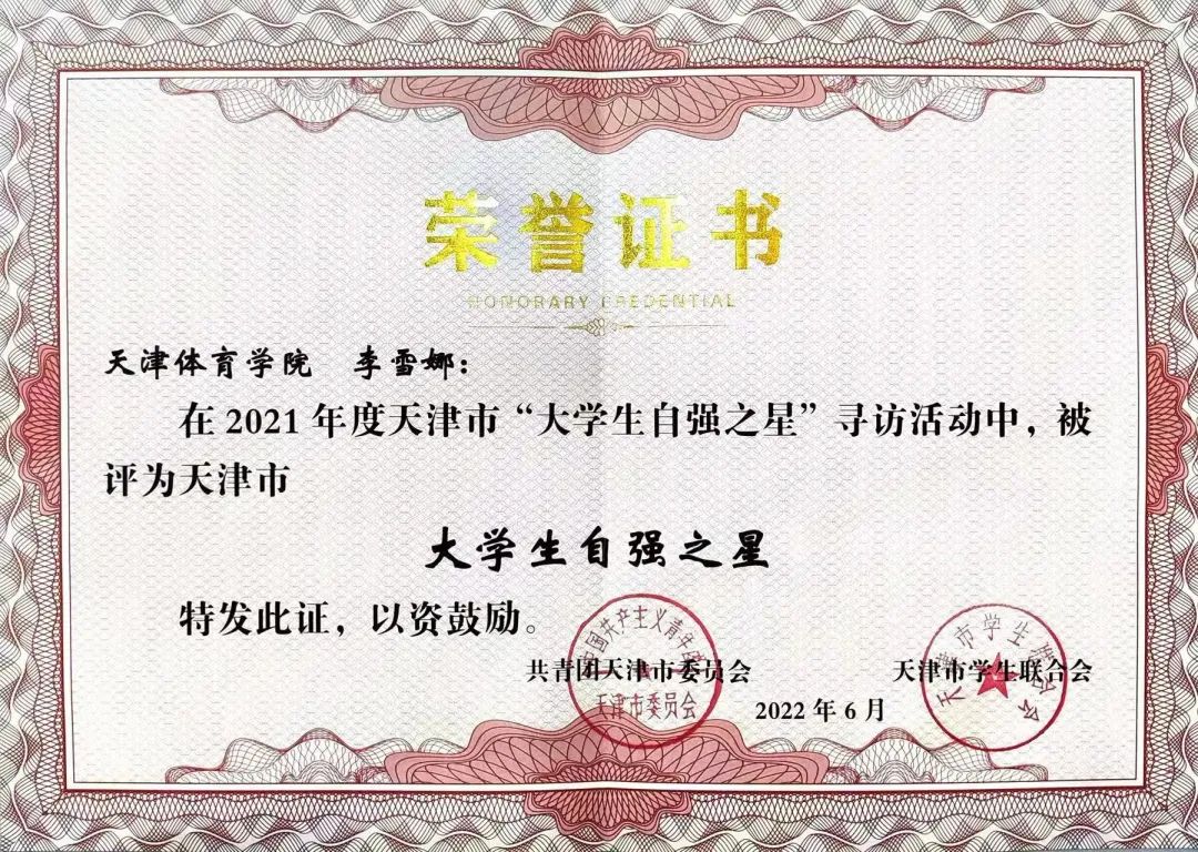 经过院级推荐、校级评审、市级遴选,我校运动训练科学学院2021级硕士研究生张京,体育文化学院2018级本科生李雪娜获得2021年度天津市“大学生自强之星”荣誉称号。