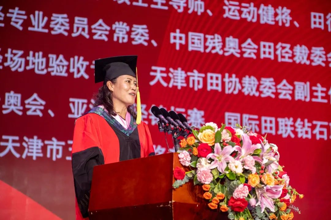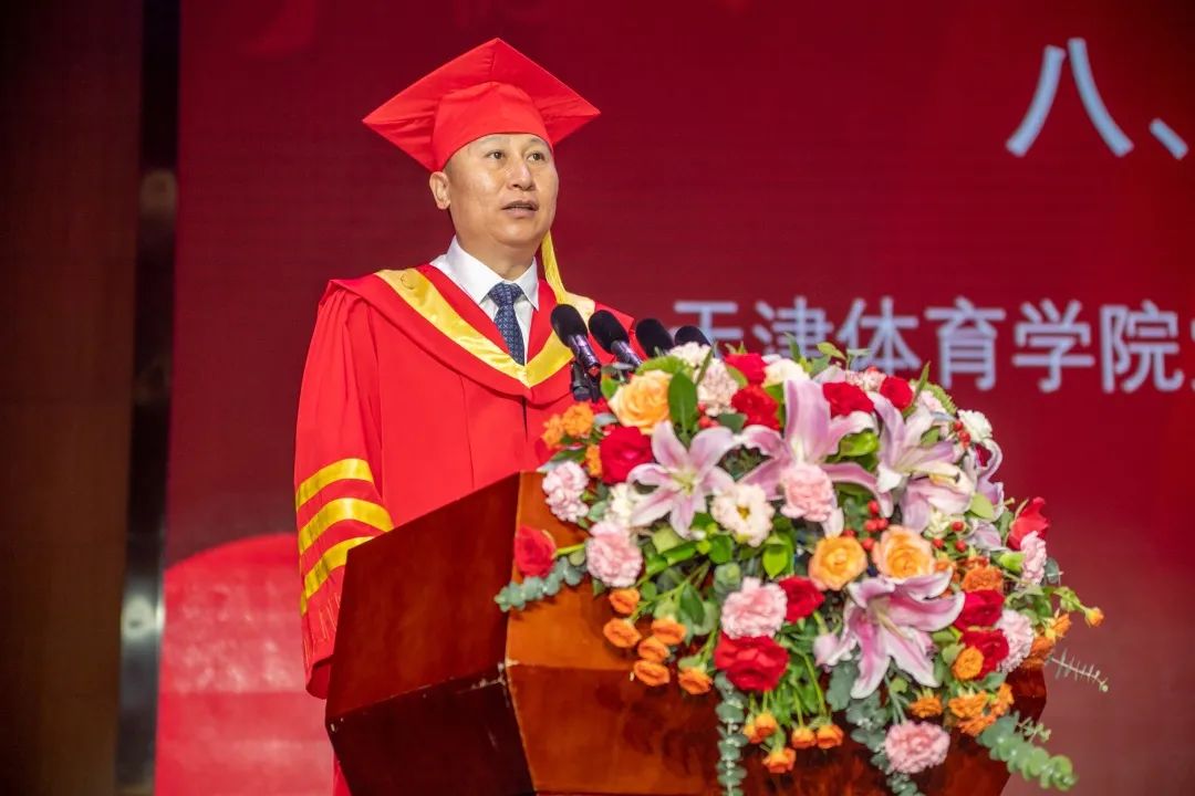 研究生毕业生代表程俊鑫在发言中回顾了自己在天体度过的七载春秋,并带领全体毕业生庄严宣誓,号召大家勇担体育强国使命,肩负民族复兴重任。