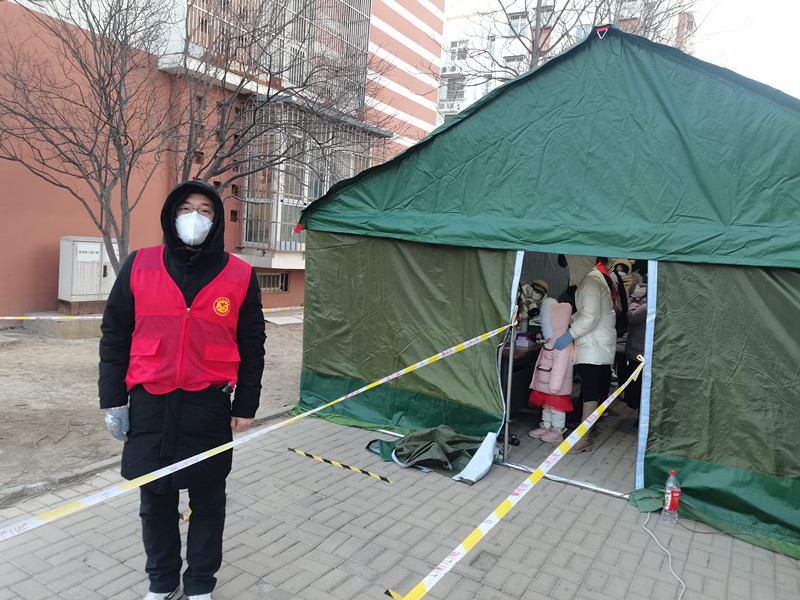 宋鑫,中共党员,大众健身指导与管理教研室教师,在西青区精武镇汇英苑社区负责入户核对居民信息和核酸筛查现场秩序维护。