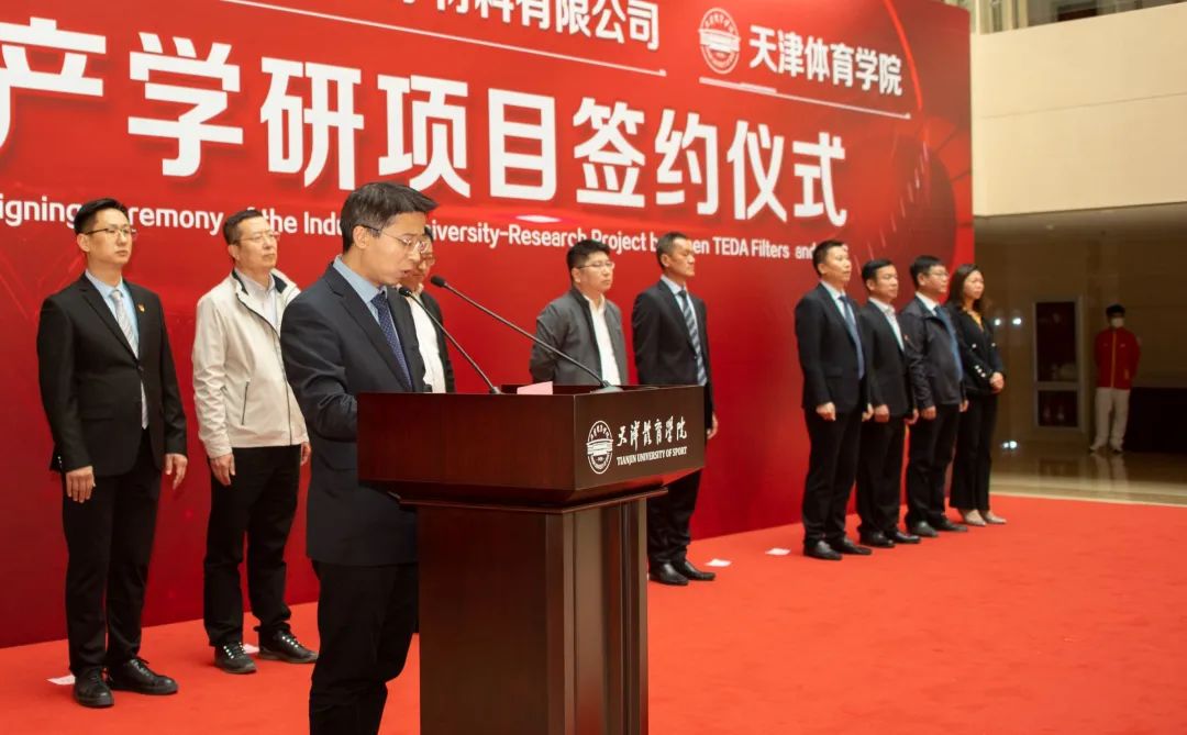 天津泰达股份有限公司党委书记、董事长张旺在致辞中表示,天津体育学院与天津纺织集团和泰达洁净,就运动口罩研发开展了产学研用合作,通过三方努力,在运动口罩研发方面取得了明显的成果。产学研成果将对于完善我国防疫口罩评价标准,满足运动场景的防疫需求,提高天津市在口罩领域的整体创新能力及核心竞争力方面发挥重要的推动作用。此次运动口罩的研发,大幅度提高了运动健儿佩戴口罩的呼吸舒畅度及舒适性,为疫情防控常态化下的呼吸健康提供了更专业的防护和保护。泰达洁净材料有限公司与天津体育学院,将深化校企合作体制创新,为科学研究、成果转化发挥积极作用,为区域经济社会发展提供强有力的科技支撑。