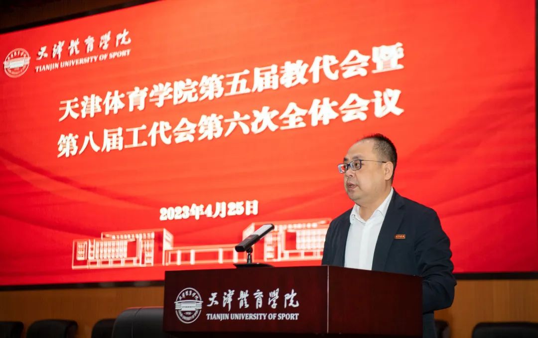 天津体育学院第五届教职工代表大会暨第八届工会会员代表大会第六次会议,于2023年4月25日在行政楼报告厅举行。全体处级以上干部、学校工会和教代会代表参加会议。会议由党委副书记宋爱军主持。