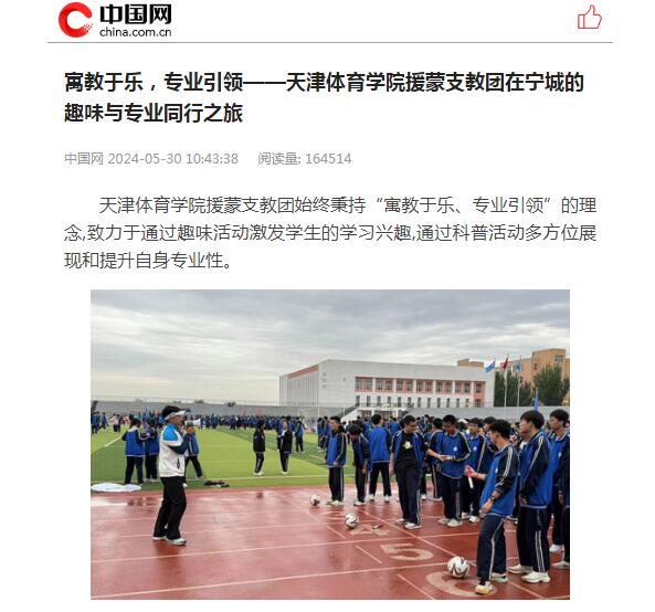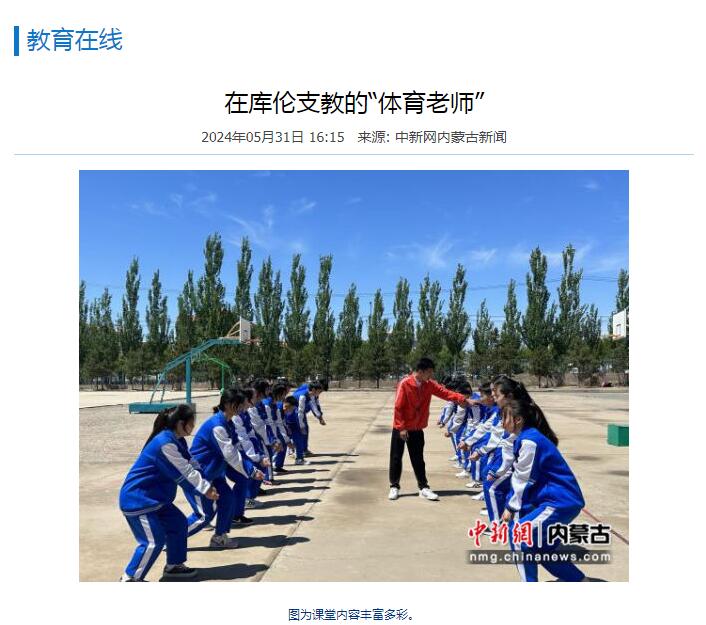 2024年5月,我校40名优秀学生和2名带队教师组成支教志愿服务团,赴赤峰市宁城县、通辽市库伦旗开展为期60天的体育支教工作。连日来,包括中国网、中国新闻网在内的多家媒体,对我校支教志愿服务团在内蒙古开展支教工作情况进行了报道。