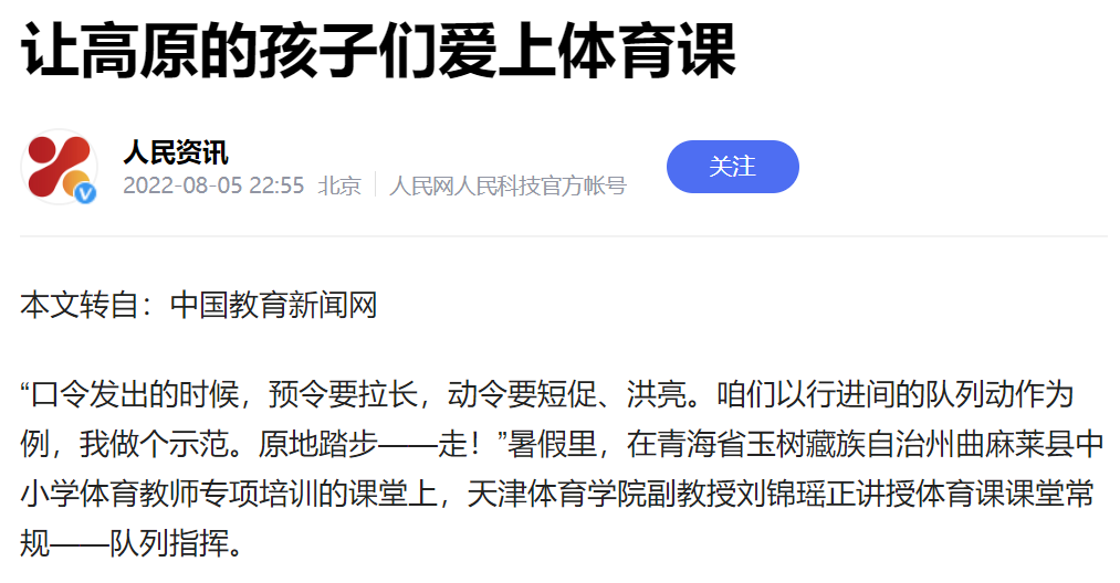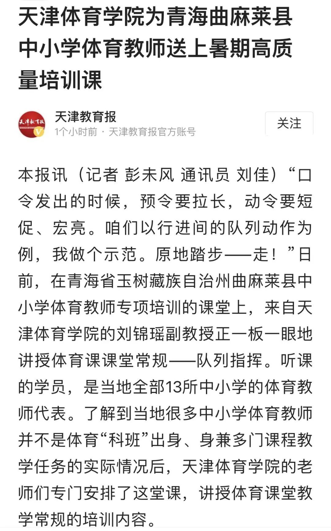 日前,我校教师赴青海省玉树藏族自治州曲麻莱县,为当地中小学体育教师开展专项培训。包括人民网、中国教育新闻网、天津日报新媒体、北方网、津云、天津教育报新媒体等在内的中央和我市多家媒体,对此进行了报道。
