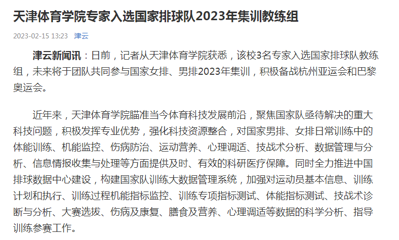 近日,人民日报客户端、中国新闻网、《天津日报》、津云、《天津教育报》等中央和我市多家媒体对我校科研团队全面助力国家男排、女排备战巴黎奥运会进行了报道。