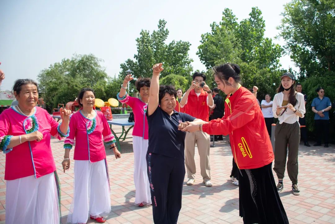 为高质量开展好学习贯彻习近平新时代中国特色社会主义思想主题教育,助力乡镇社区居民养成科学合理的体育运动习惯,全面提高人民群众身体素质,近日,天津体育学院师生赴静海区大丰堆镇后明庄村,参加由市政协组织的“为群众办实事”活动。活动中,天津体育学院传媒与艺术学院师生,向村民展示了师生创编的传统傣族舞蹈《陶醉了》,并对村民自排自练的秧歌舞等舞蹈进行专业指导。