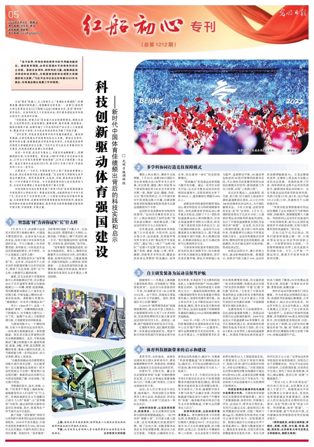 《光明日报》调研组于今年5至7月,走访了包括天津体育学院在内的体育院校和科研院所,探秘科技创新如何驱动体育强国建设,感受科技为体育强国建设提供的中国方案、中国智慧、中国力量。8月4日,《光明日报》“红船初心”专刊以“科技创新驱动体育强国建设——新时代中国体育佳绩频出背后的科技实践和启示”为题,报道我校以科技创新助力体育发展、助推体育强国建设情况。