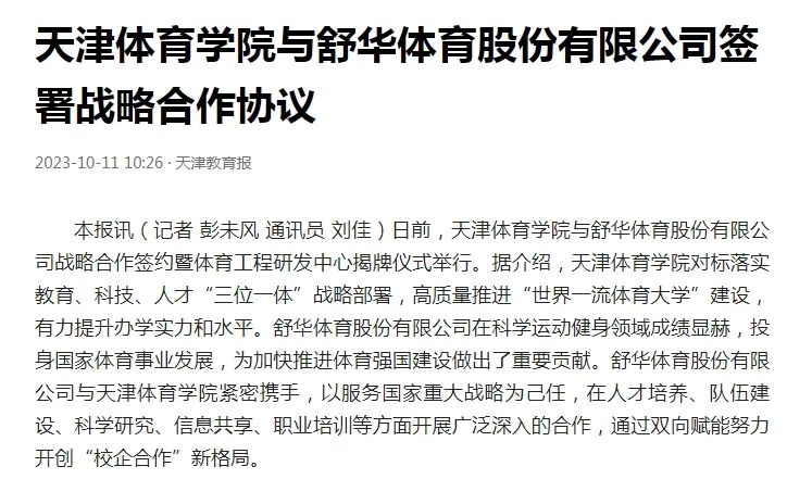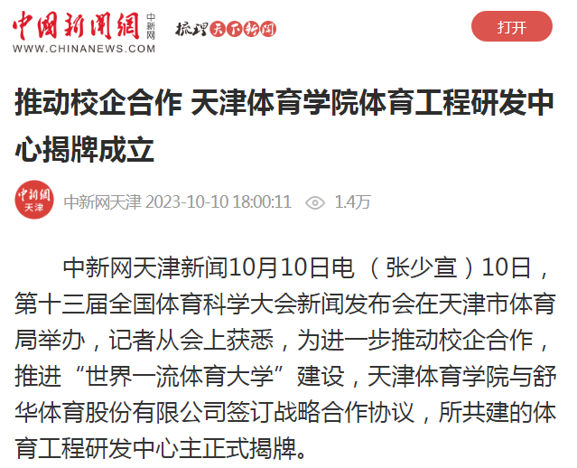 2023年10月10日,天津体育学院与舒华体育股份有限公司战略合作签约暨体育工程研发中心揭牌仪式举行。中国新闻网、天津教育报新媒体等对此进行了报道。