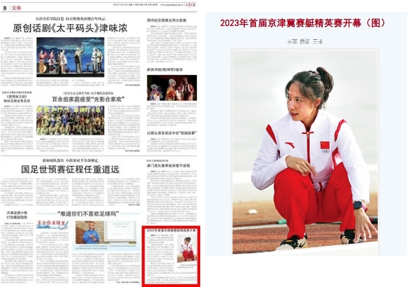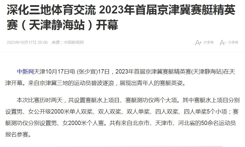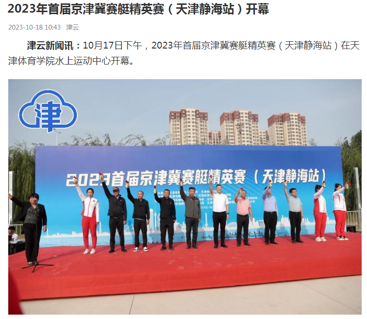 2023年10月17日,2023年首届京津冀赛艇精英赛(天津静海站)在天津体育学院水上运动中心开幕,比赛设置赛艇水上项目、赛艇测功仪两个大项,来自北京市、天津市、河北省的50余名运动员报名参赛。中国新闻网、天津电视台、《天津日报》、津云等多家媒体对此进行了报道。