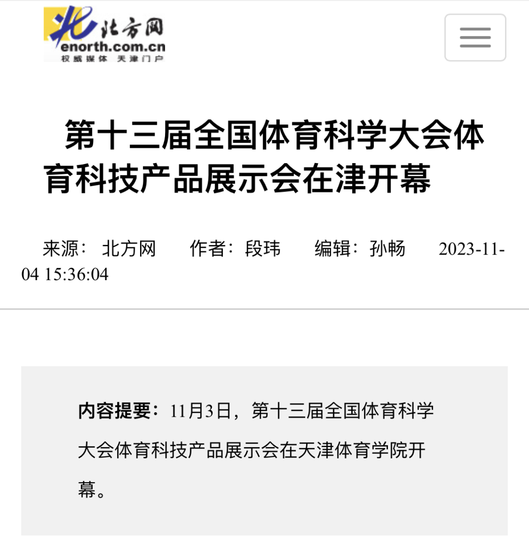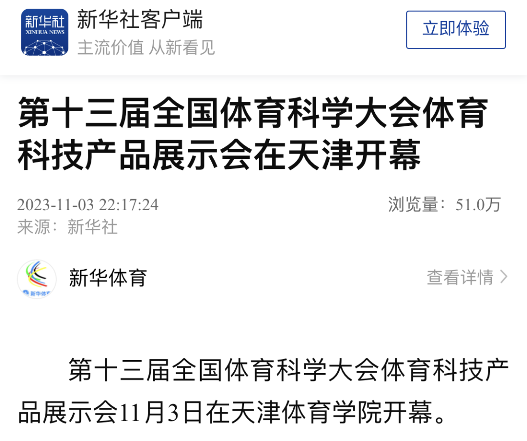 2023年11月3日下午,第十三届全国体育科学大会体育科技产品展示会在天津体育学院隆重开幕。新华社、央广网、国家体育总局官网、津云、北方网等中央和我市多家媒体对此进行了报道。