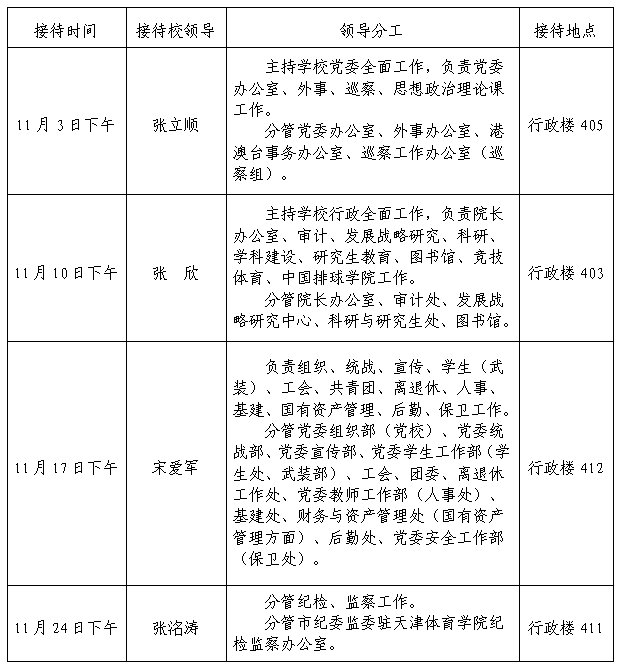 根据《天津体育学院领导干部接待日制度》规定及学校近期工作安排,现将2022年11月校领导接待师生来访安排通知如下。