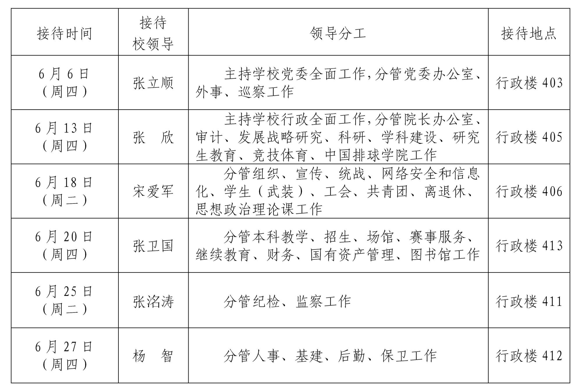 根据《天津体育学院领导干部接待日制度》规定及学校近期工作安排,现将2024年6月校领导接待师生来访安排通知如下: